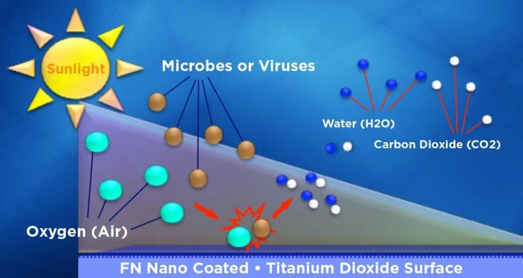 The nanotechnology works with TiO2 (Titanium Dioxide) via photocatalysis*.